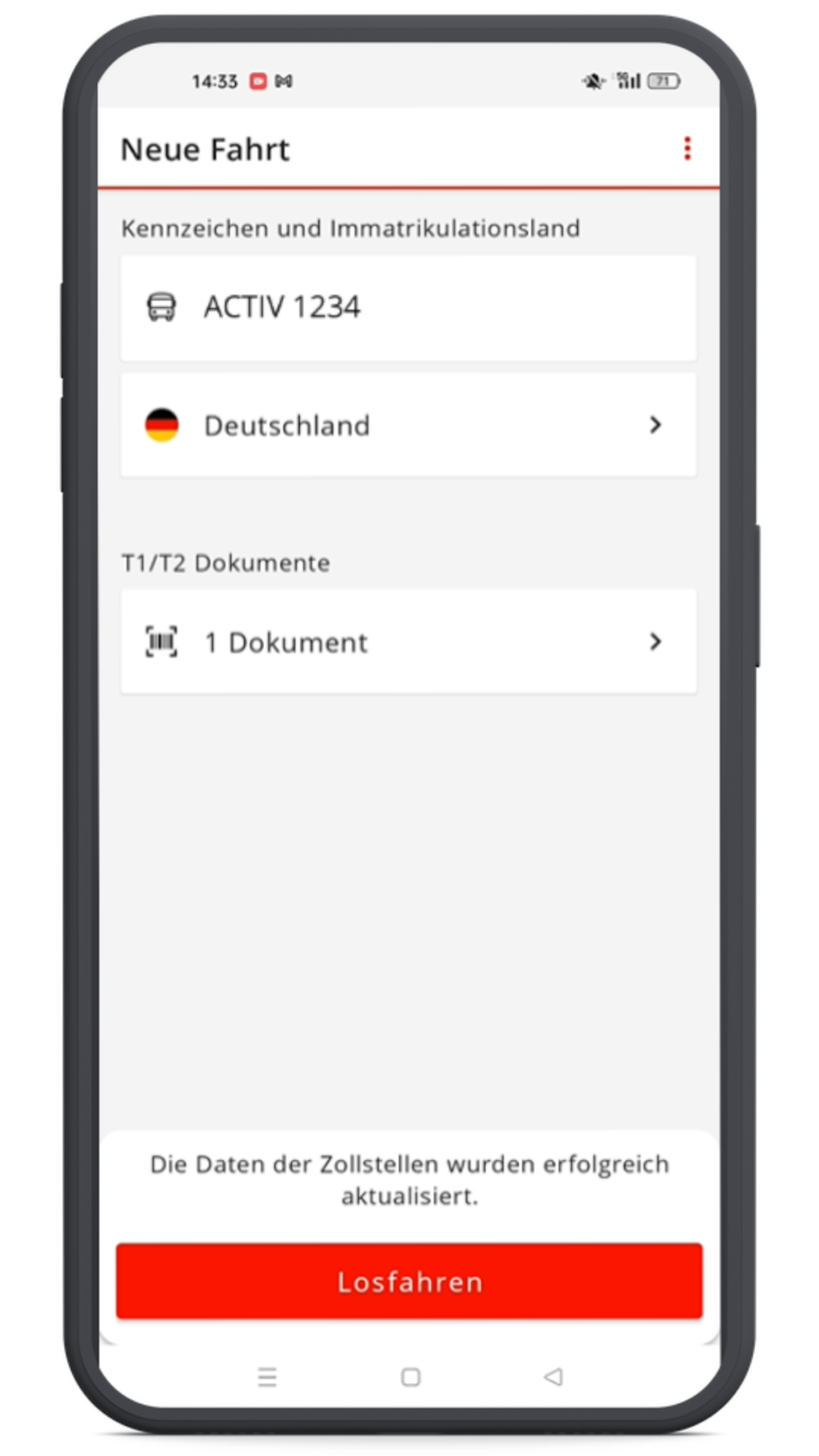 Nutzen Sie die kostenlose Activ App, um Ihre Transitdokumente effizient zu verwalten und den Zollübergang in der Schweiz zu beschleunigen. Die App bietet eine einfache Fünf-Schritte-Anleitung zur Eingabe von Fahrzeug- und Dokumentdaten.
