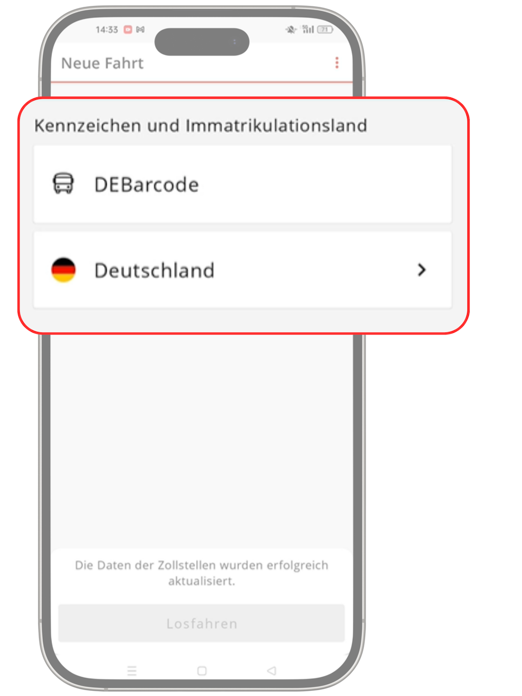 Geben Sie das Kennzeichen (Zugfahrzeug) und das Immatrikulationsland des Fahrzeugs an.