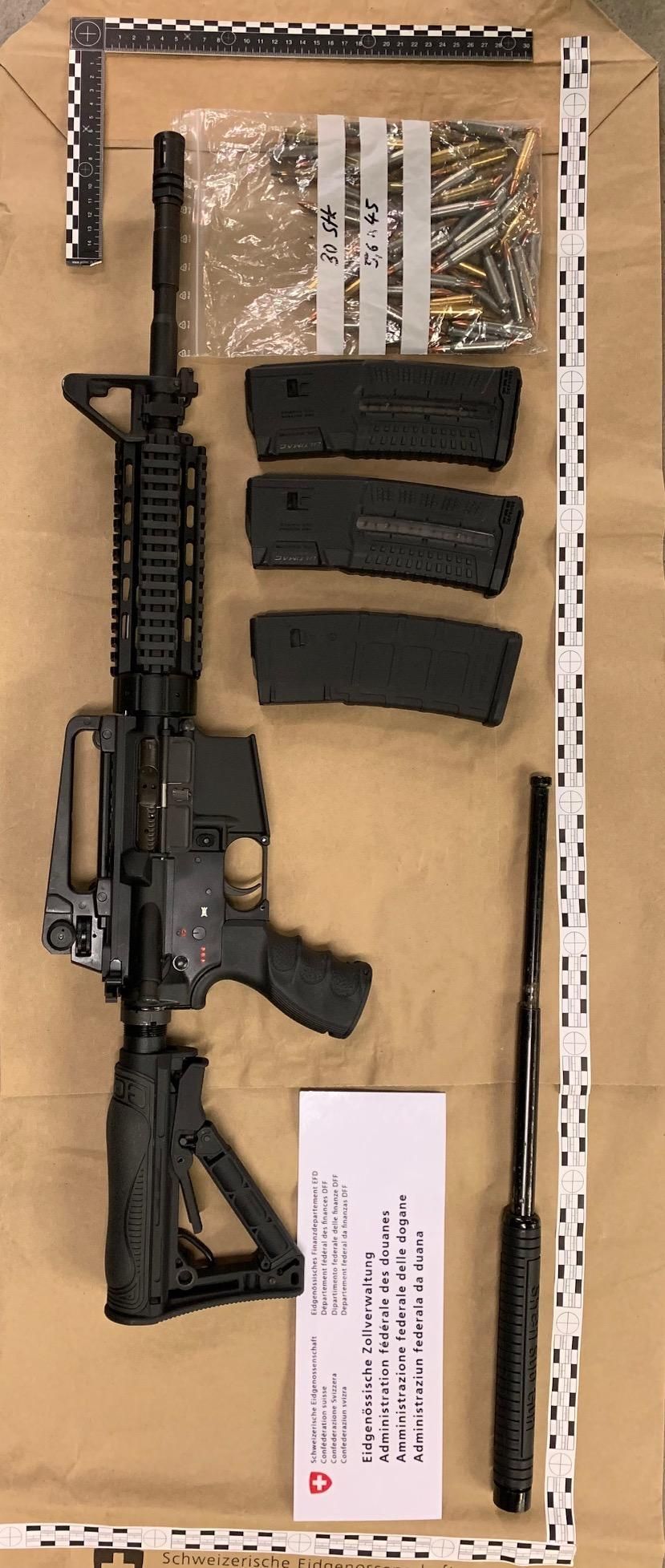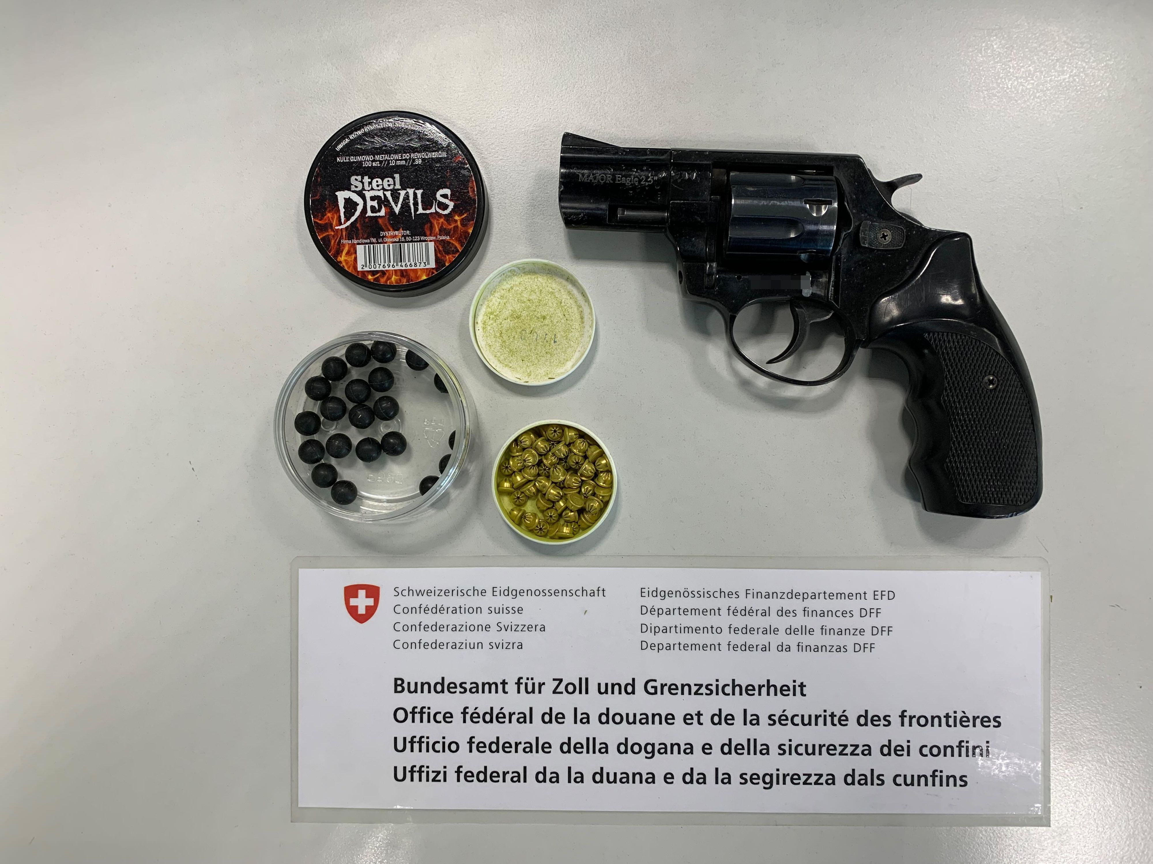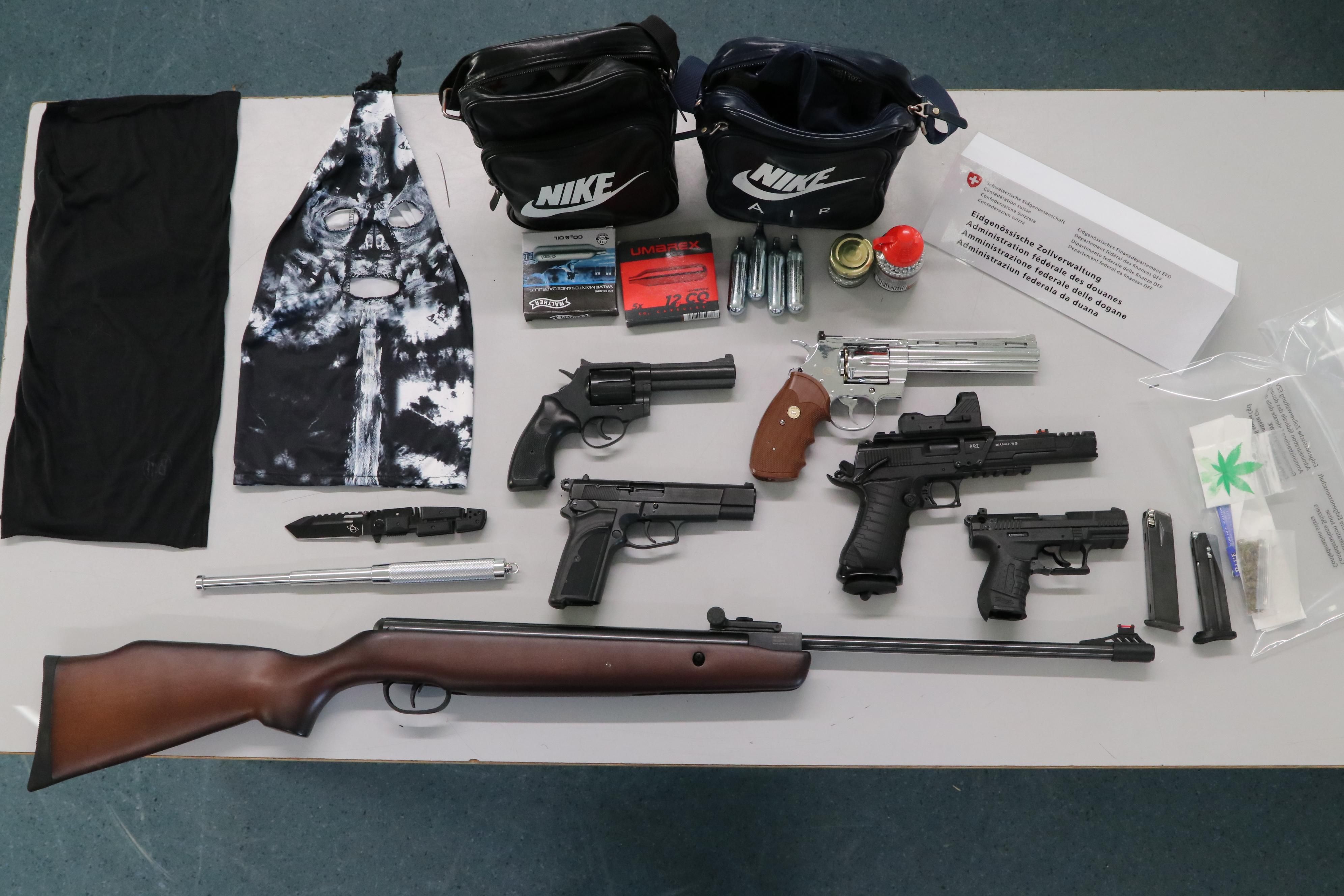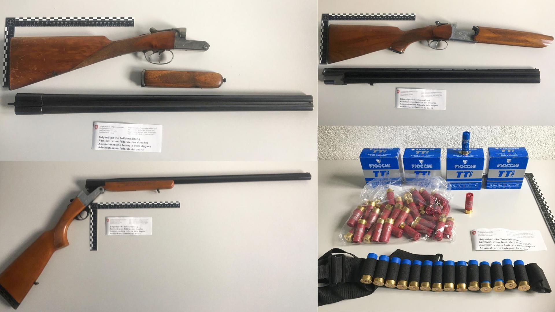 Martina (GR): Am 11. März 2025 kontrollierten Mitarbeitende des BAZG einen Personenwagen mit polnischem Kontrollschild bei der Einreise in Martina. Im Fahrzeug befanden sich zwei Frauen und ein Mann, alle mit polnischer Nationalität. Beim Verlassen des Fahrzeuges versuchte eine der Frauen eine Tasche unter dem Auto zu verstecken. Der Versuch misslang und die Mitarbeitenden des BAZG öffneten die Tasche. Sie stiessen auf zwei Pakete mit jeweils einer Schusswaffe darin. Hinzugezogene Fahrzeugspezialisten des BAZG kontrollierten darauf das Fahrzeug eingehend. Dabei kam diverses Einbruchswerkzeug zum Vorschein.