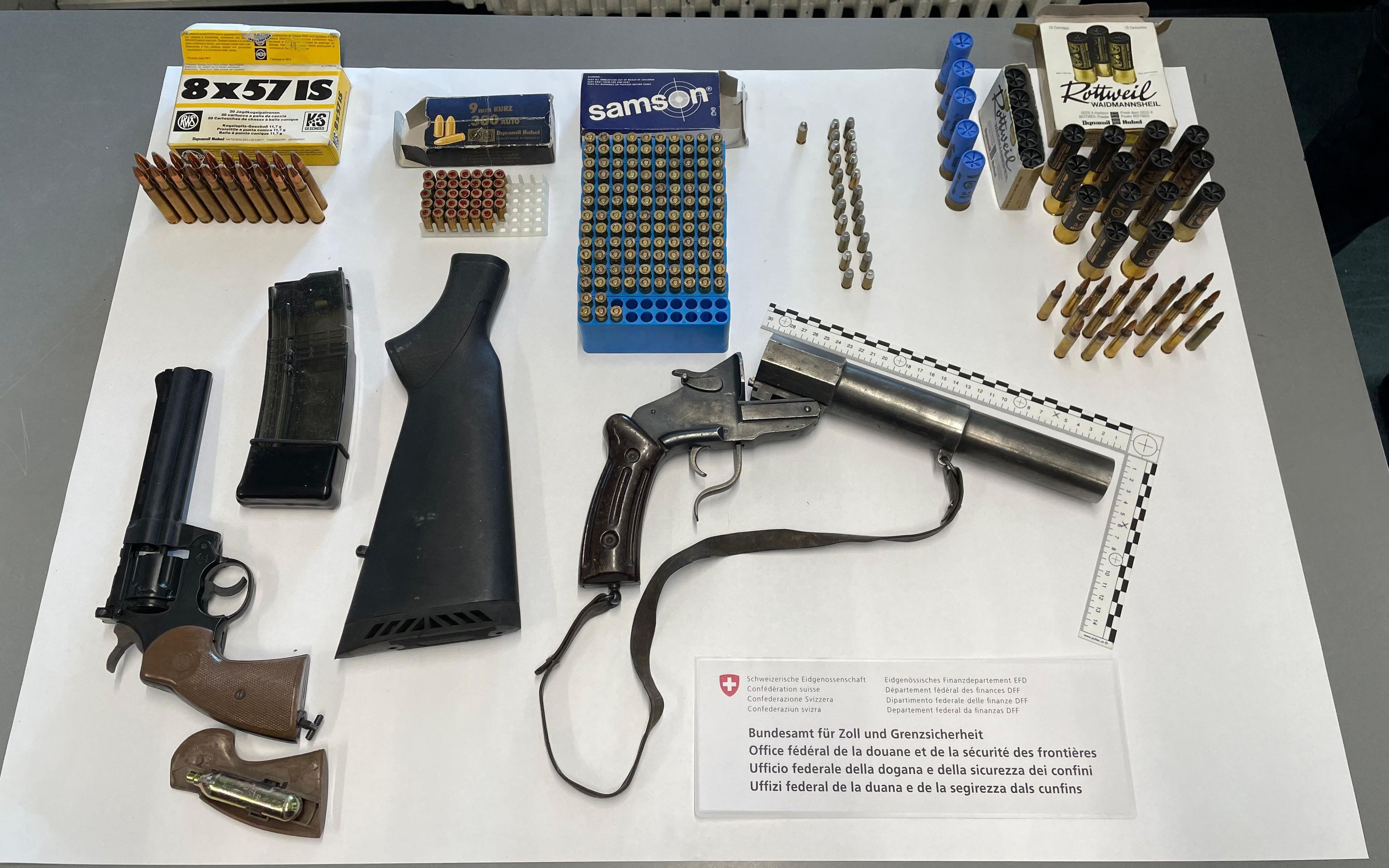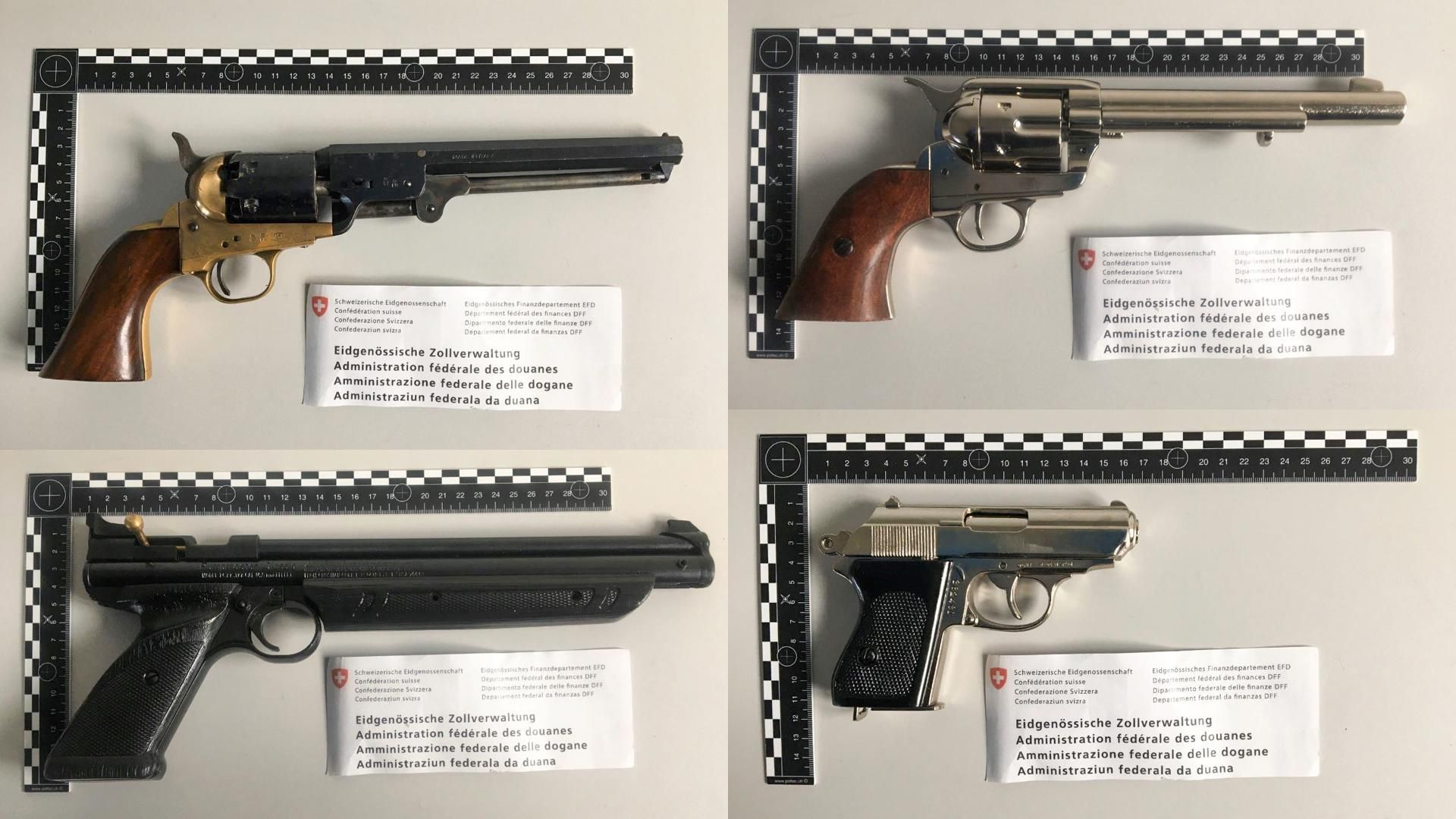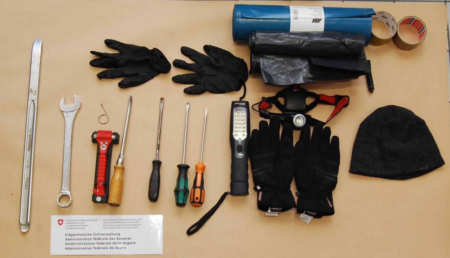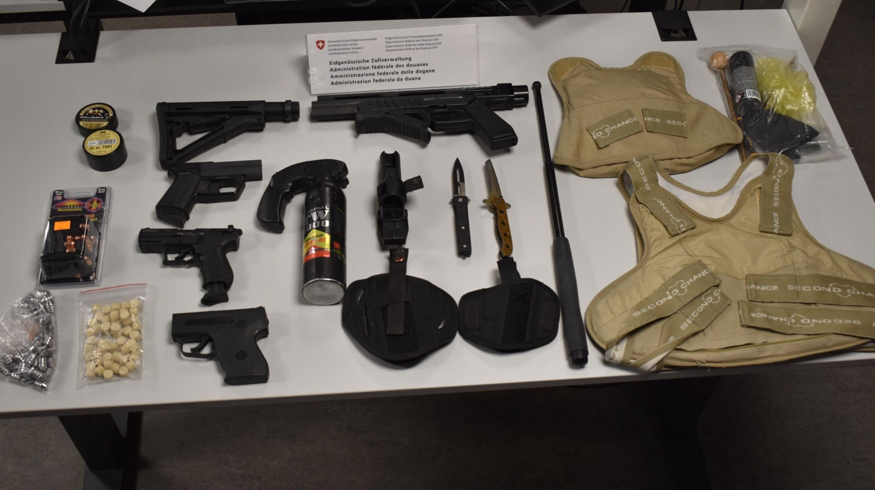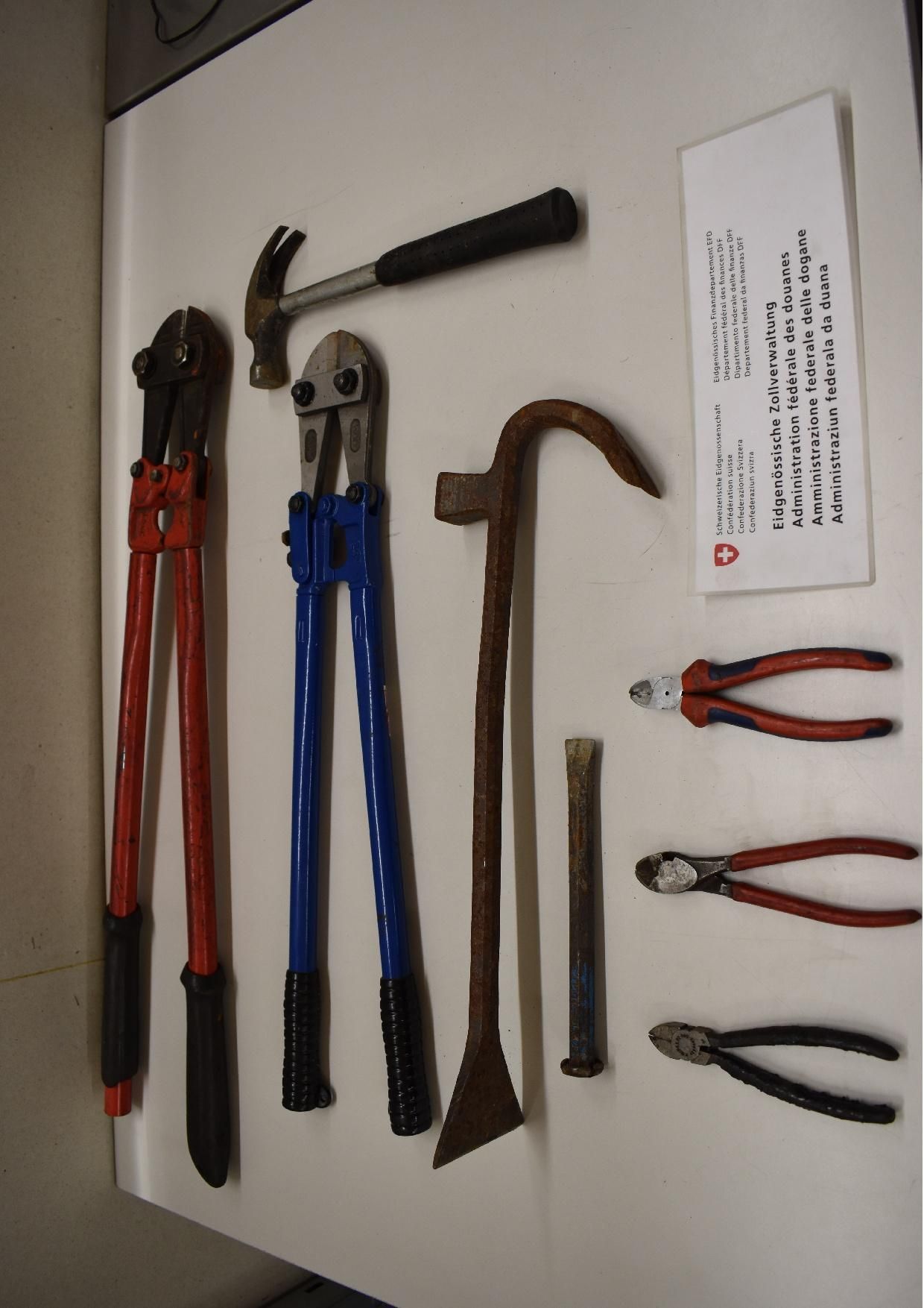 Martina (GR): Am 11. März 2025 kontrollierten Mitarbeitende des BAZG einen Personenwagen mit polnischem Kontrollschild bei der Einreise in Martina. Im Fahrzeug befanden sich zwei Frauen und ein Mann, alle mit polnischer Nationalität. Beim Verlassen des Fahrzeuges versuchte eine der Frauen eine Tasche unter dem Auto zu verstecken. Der Versuch misslang und die Mitarbeitenden des BAZG öffneten die Tasche. Sie stiessen auf zwei Pakete mit jeweils einer Schusswaffe darin. Hinzugezogene Fahrzeugspezialisten des BAZG kontrollierten darauf das Fahrzeug eingehend. Dabei kam diverses Einbruchswerkzeug zum Vorschein.