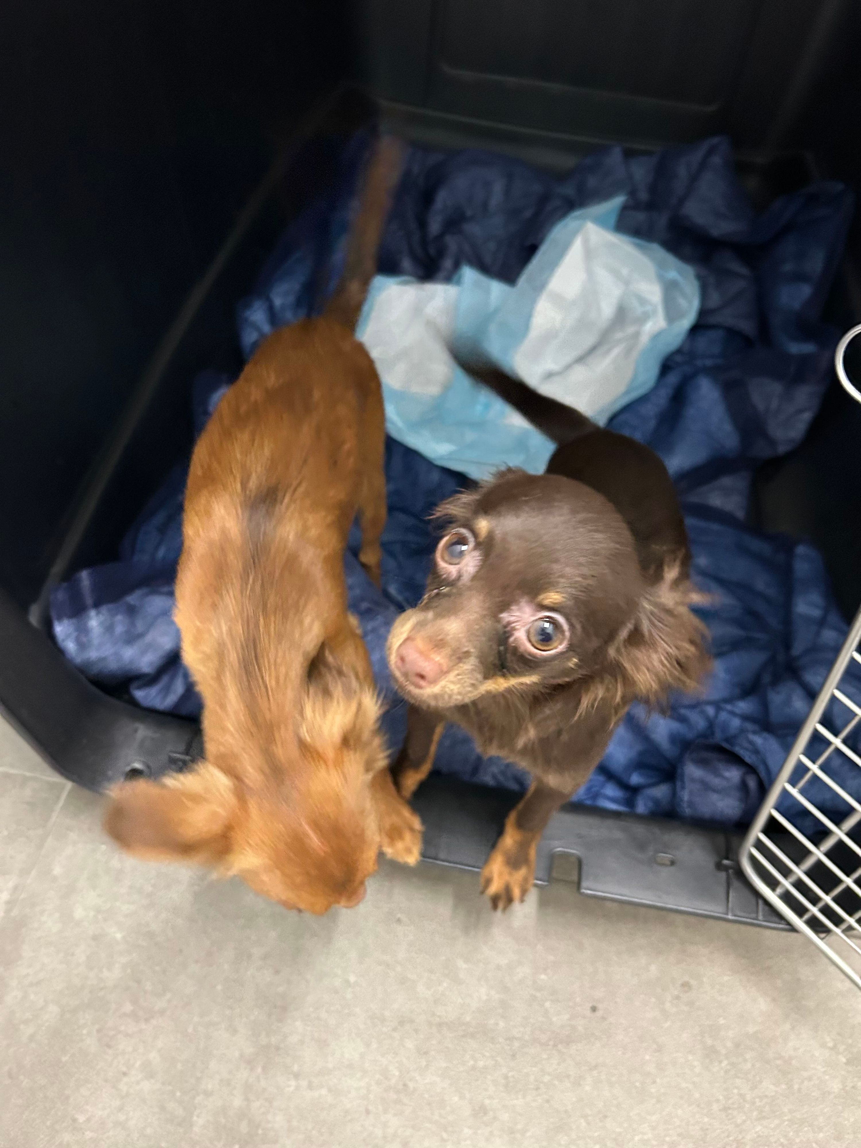 Zwei kleine Hunde in einer Transportbox auf einer blauen Decke. — © BAZG