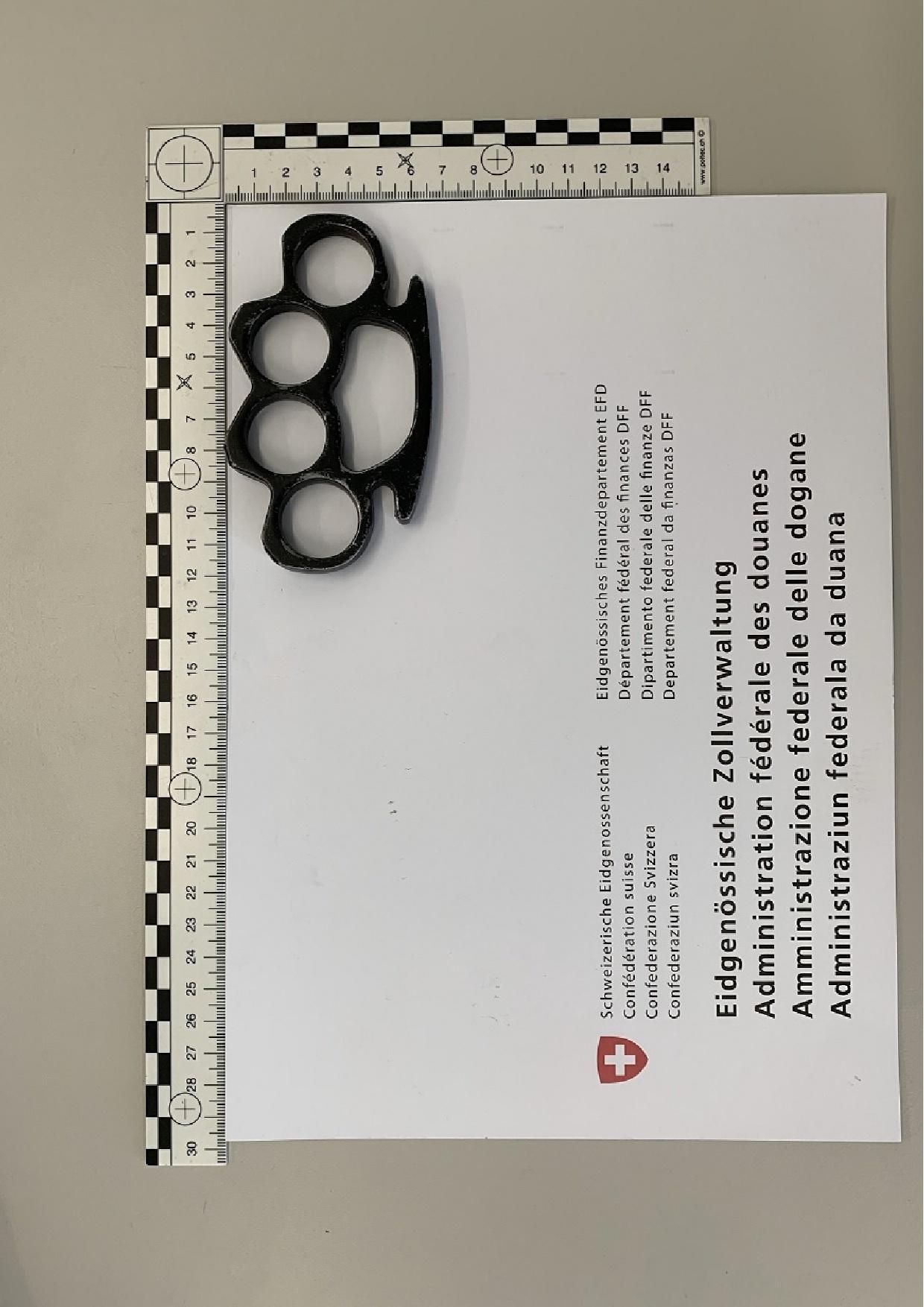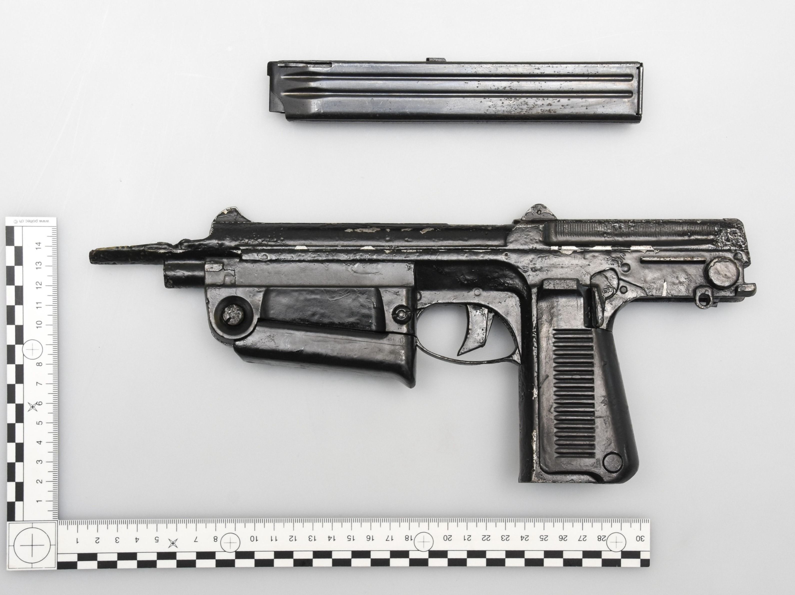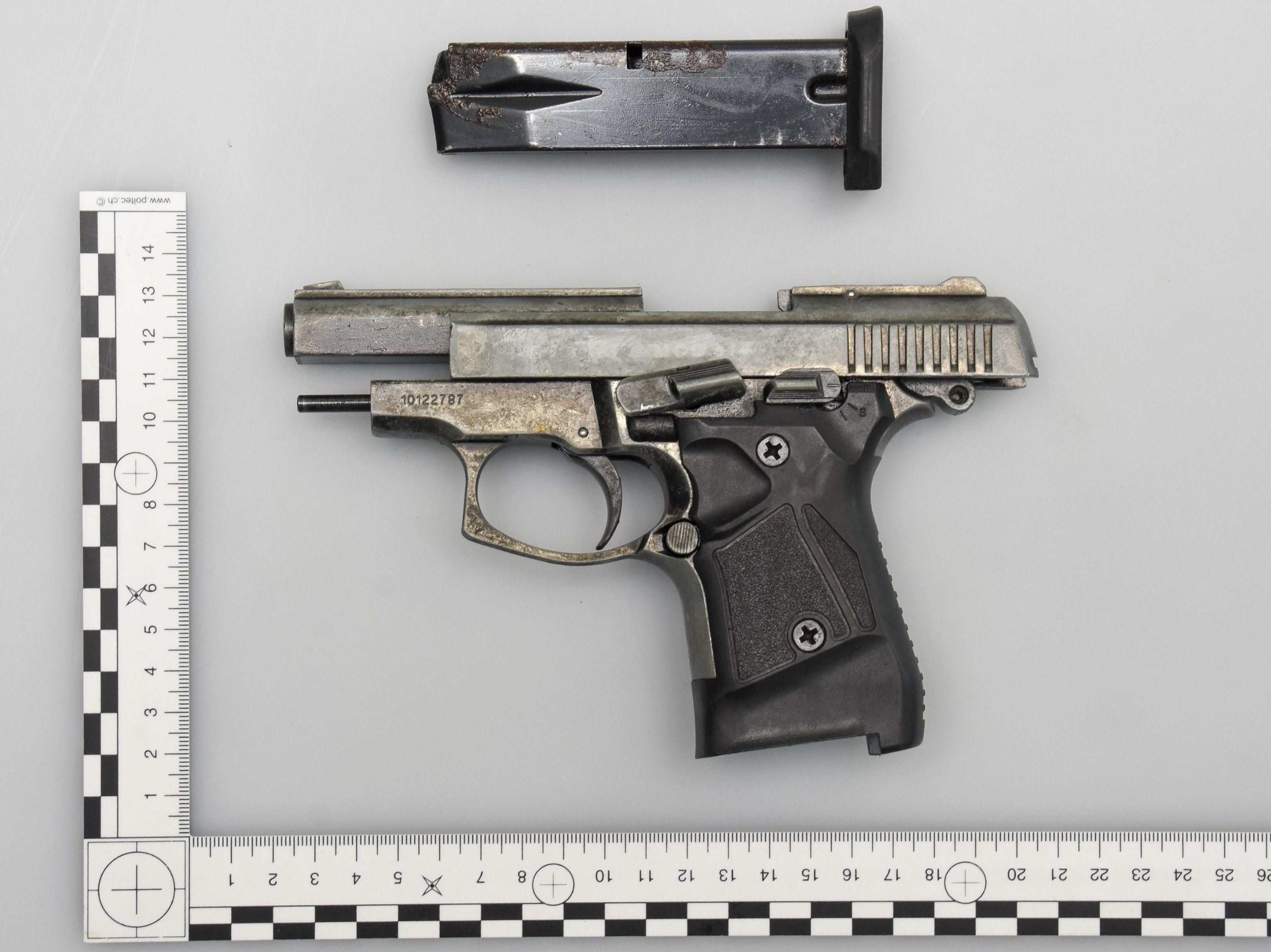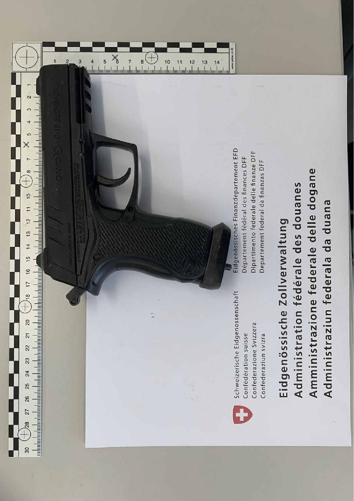 Eine Pistole mit Magazin abgenommen, dargestellt neben einem Massstab für Grössenvergleich. — © BAZG