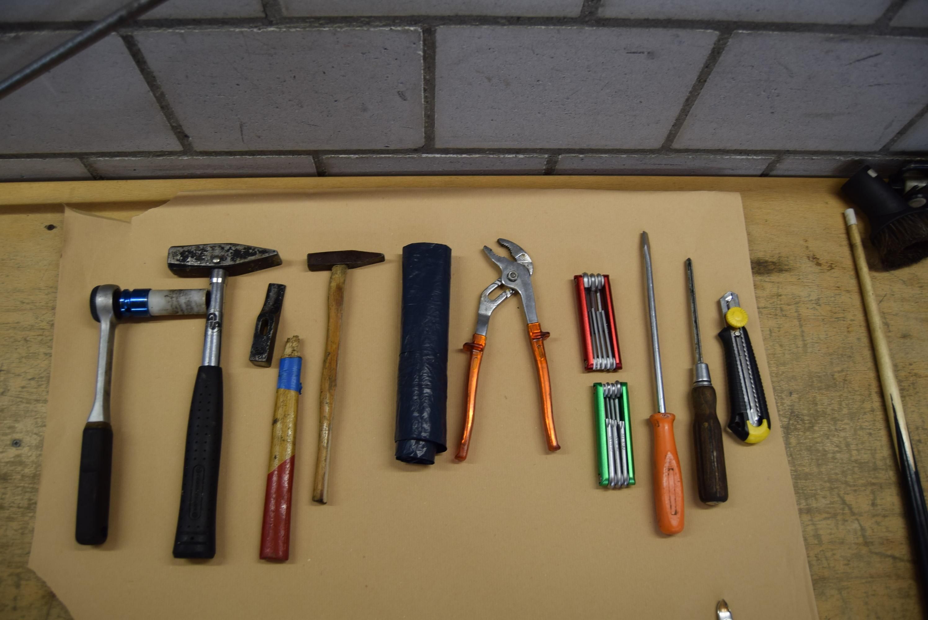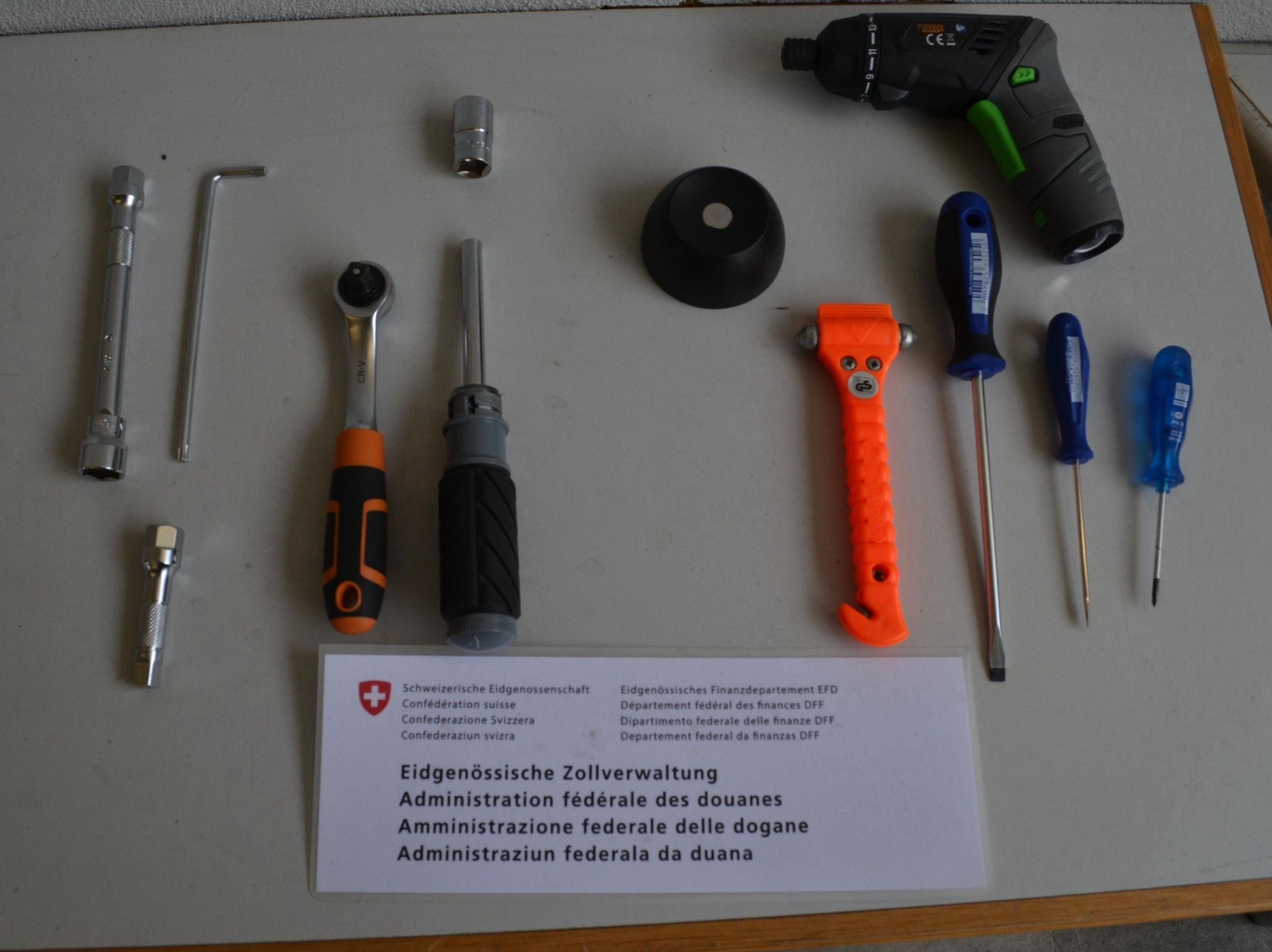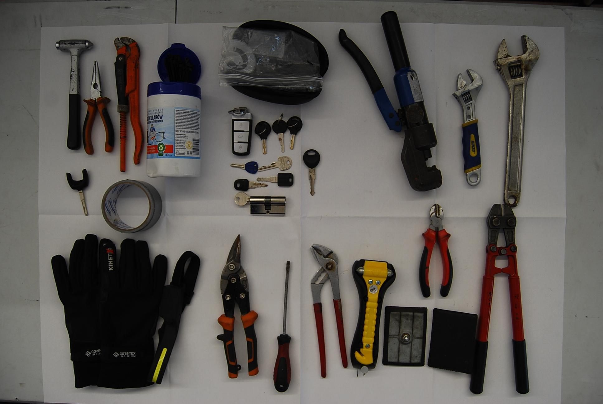 Diverse Werkzeuge für mechanische Arbeiten und Sicherheitsschlüssel ausgebreitet auf einem Tisch. — © BAZG BAZG stellt Schusswaffen sicher (24.03.2025)