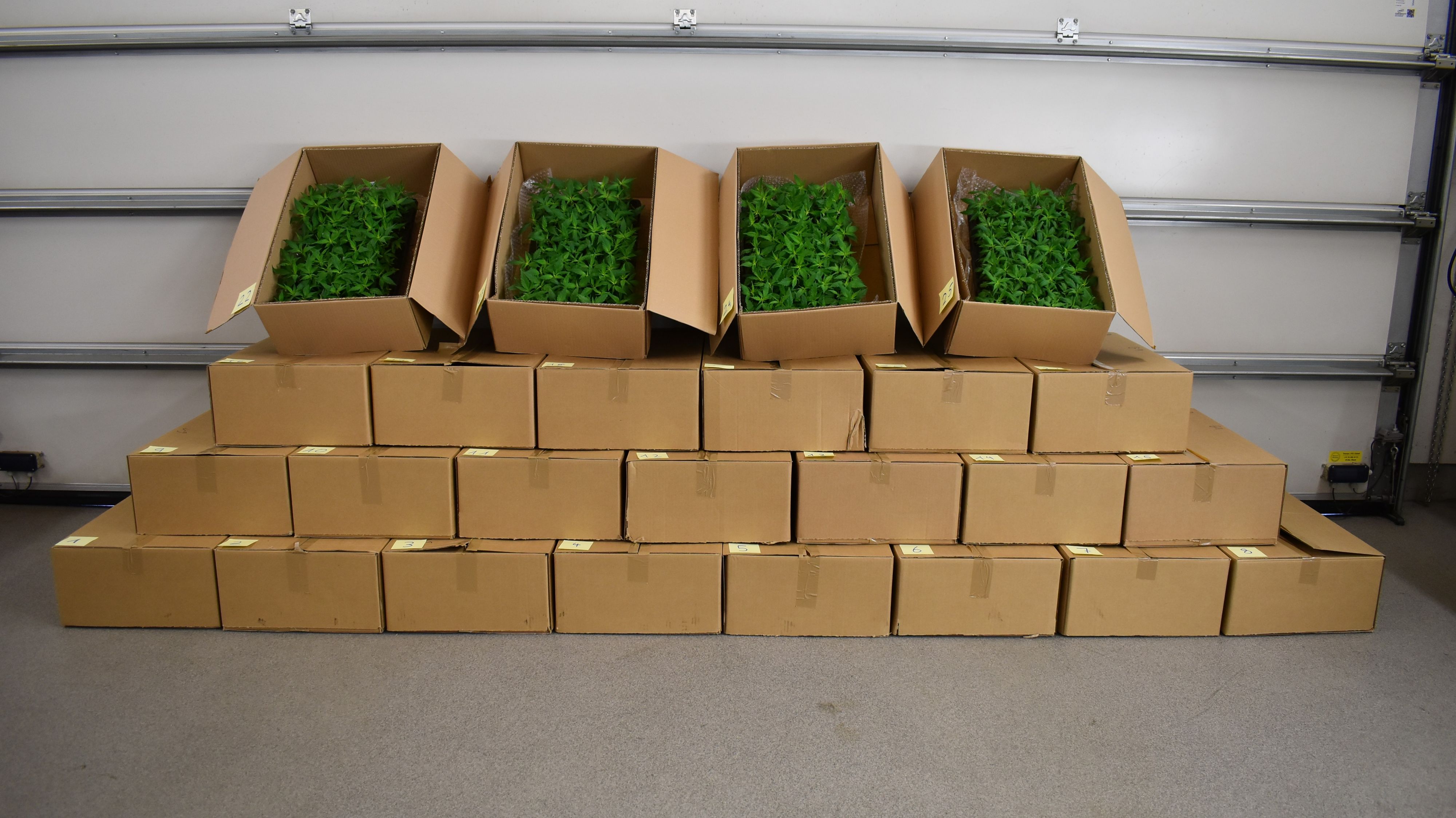 Sichergestellte Hanfpflanzen in mehreren Kartonschachteln in St. Margrethen. Die Jungpflanzen sind eng nebeneinander aufgereiht. — © BAZG
