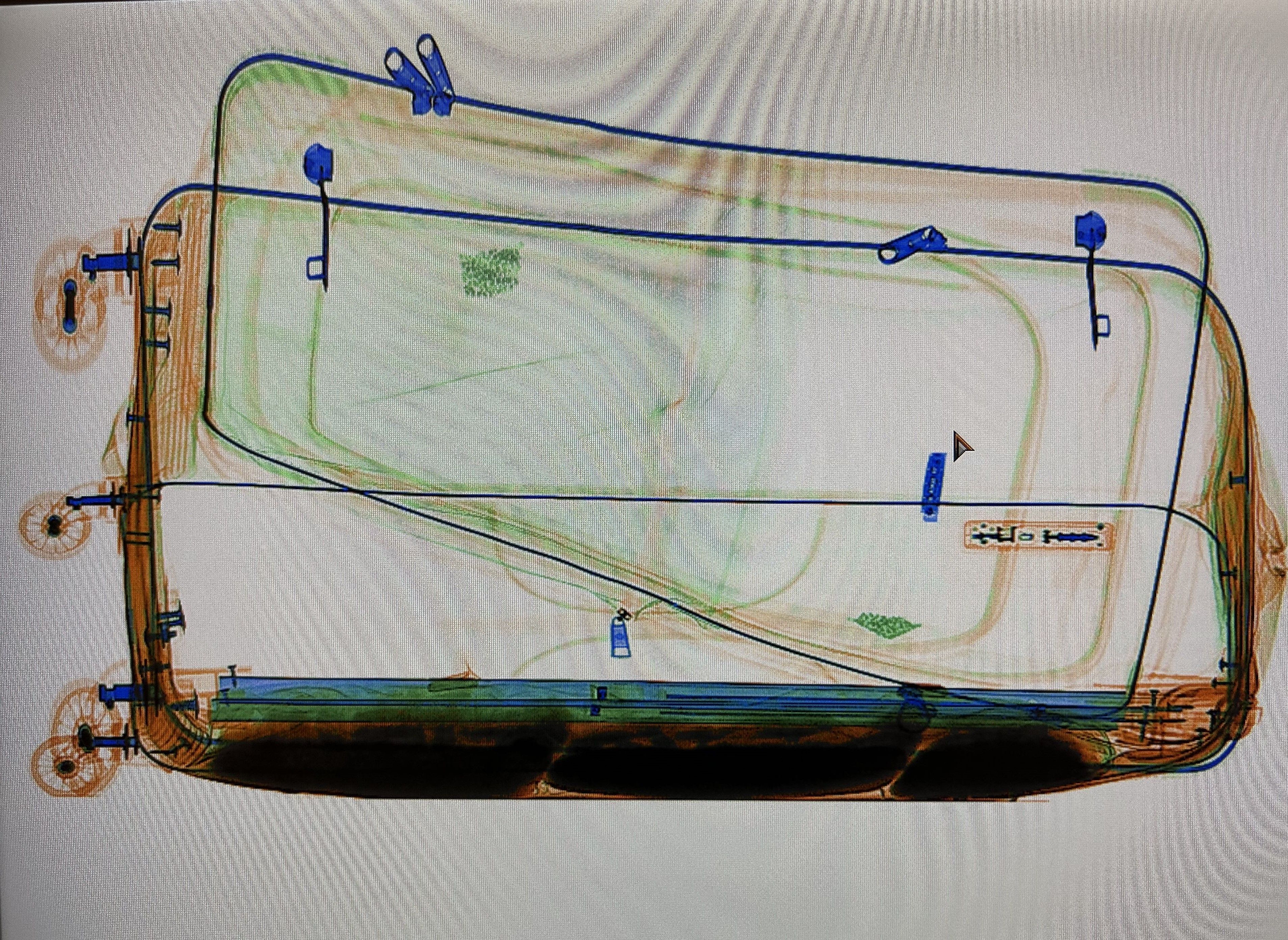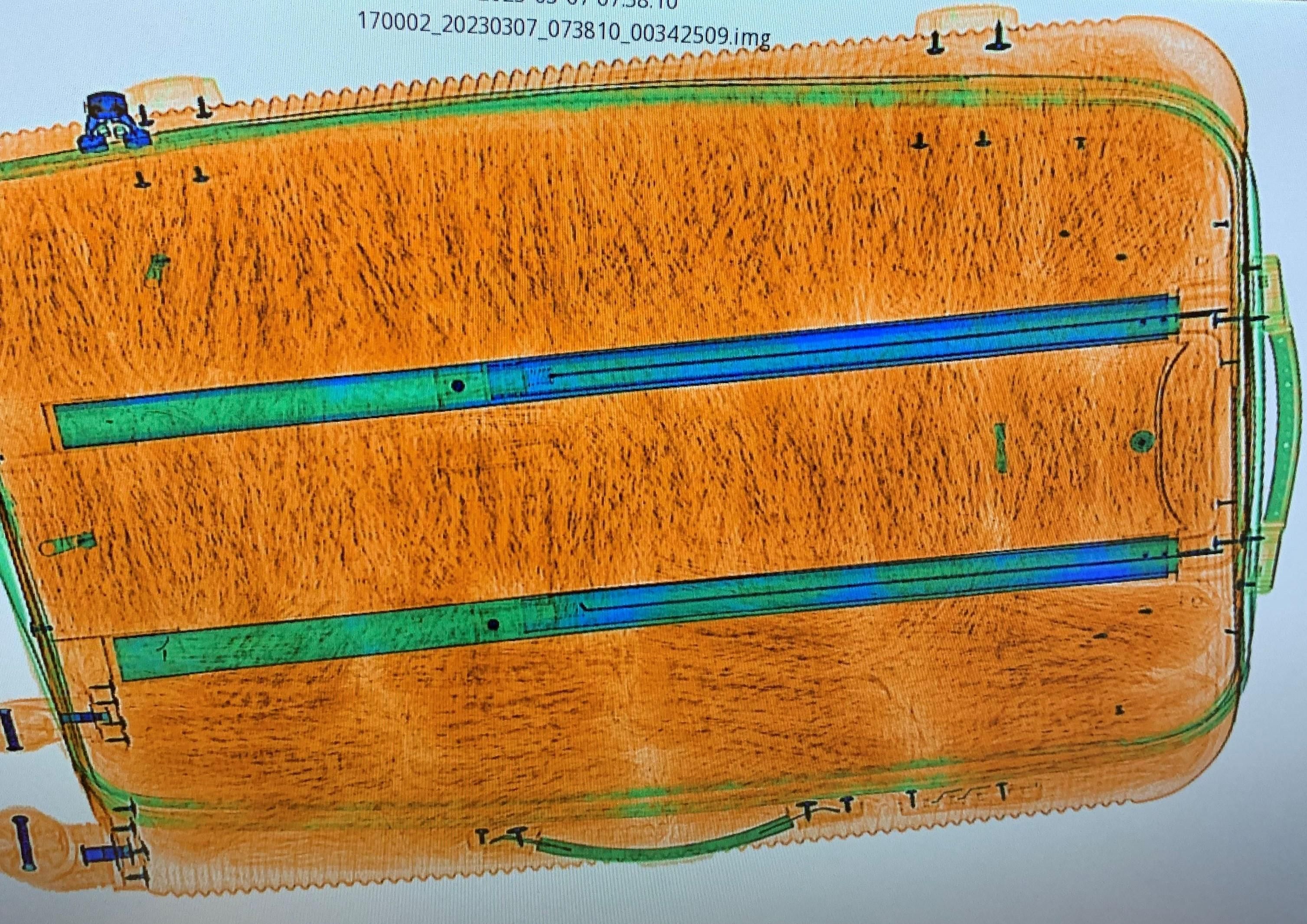 Röntgenbild eines Koffers mit doppeltem Boden, das die innere Struktur zeigt. — © BAZG Bei der Kontrolle eines Personenwagens Mitte März im Kanton St. Gallen stellten Mitarbeitende des Bundesamts für Zoll und Grenzsicherheit (BAZG) im Kofferraum diverse ungekühlte Tierkörper sowie weiteres Fleisch fest. Da die Ware zudem nicht angemeldet war, leitete das BAZG eine Strafuntersuchung ein.