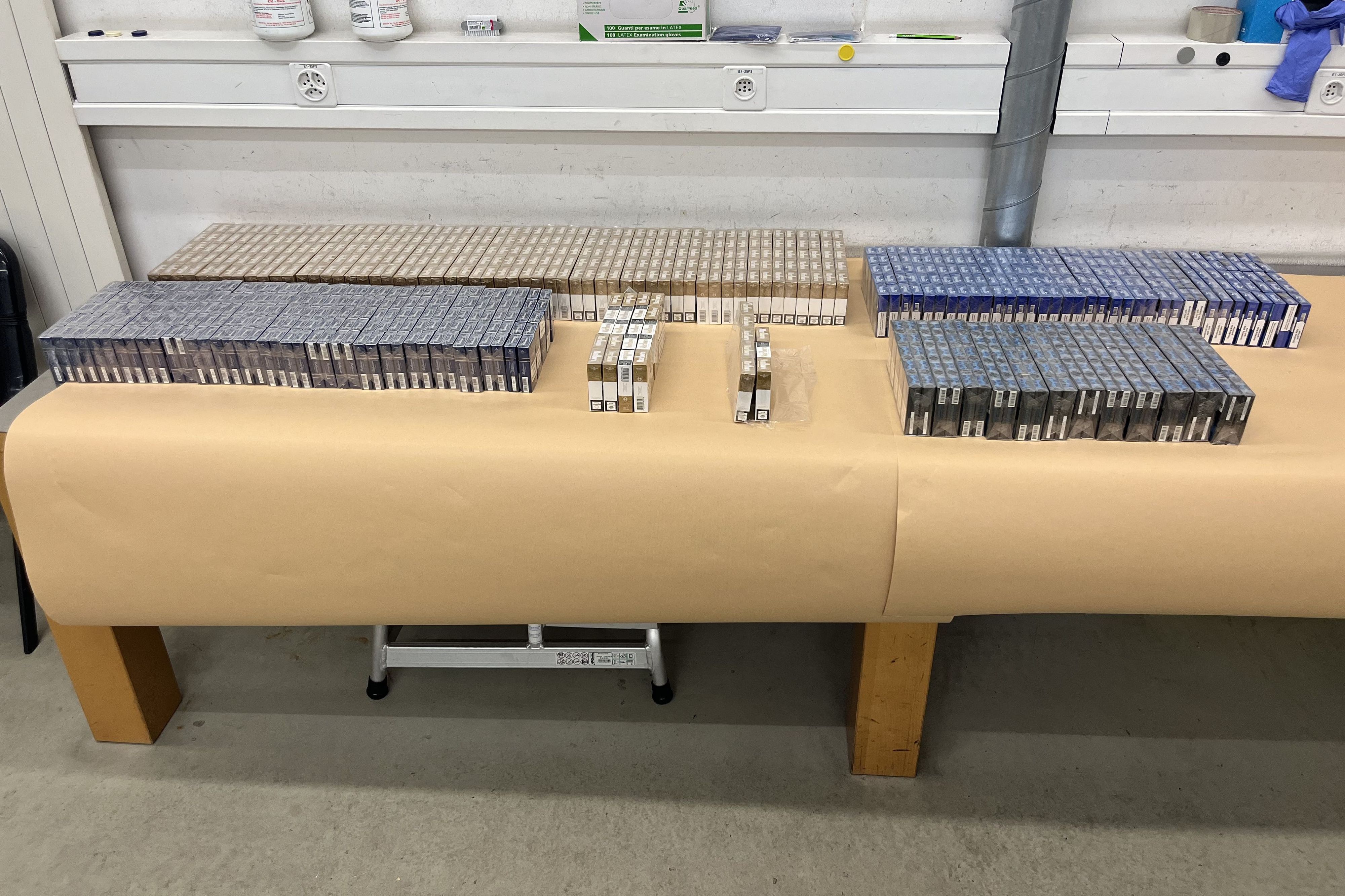 Sichergestellte Zigarettenpackungen auf einem Tisch in einem Lagerraum. — © BAZG Anfang Mai haben Mitarbeitende des Bundesamts für Zoll und Grenzsicherheit (BAZG) im Raum Basel ein von Frankreich in die Schweiz reisendes Fahrzeug mit Schweizer Kennzeichen angehalten und kontrolliert. Im Fahrzeug sassen zwei Erwachsene, ein Mann und eine Frau, sowie drei Kinder, allesamt mit französischer Staatsbürgerschaft. Im Kofferraum haben die Mitarbeitenden des BAZG fast 50 Kilogramm mit synthetischen Cannabinoiden versetztes CBD festgestellt.