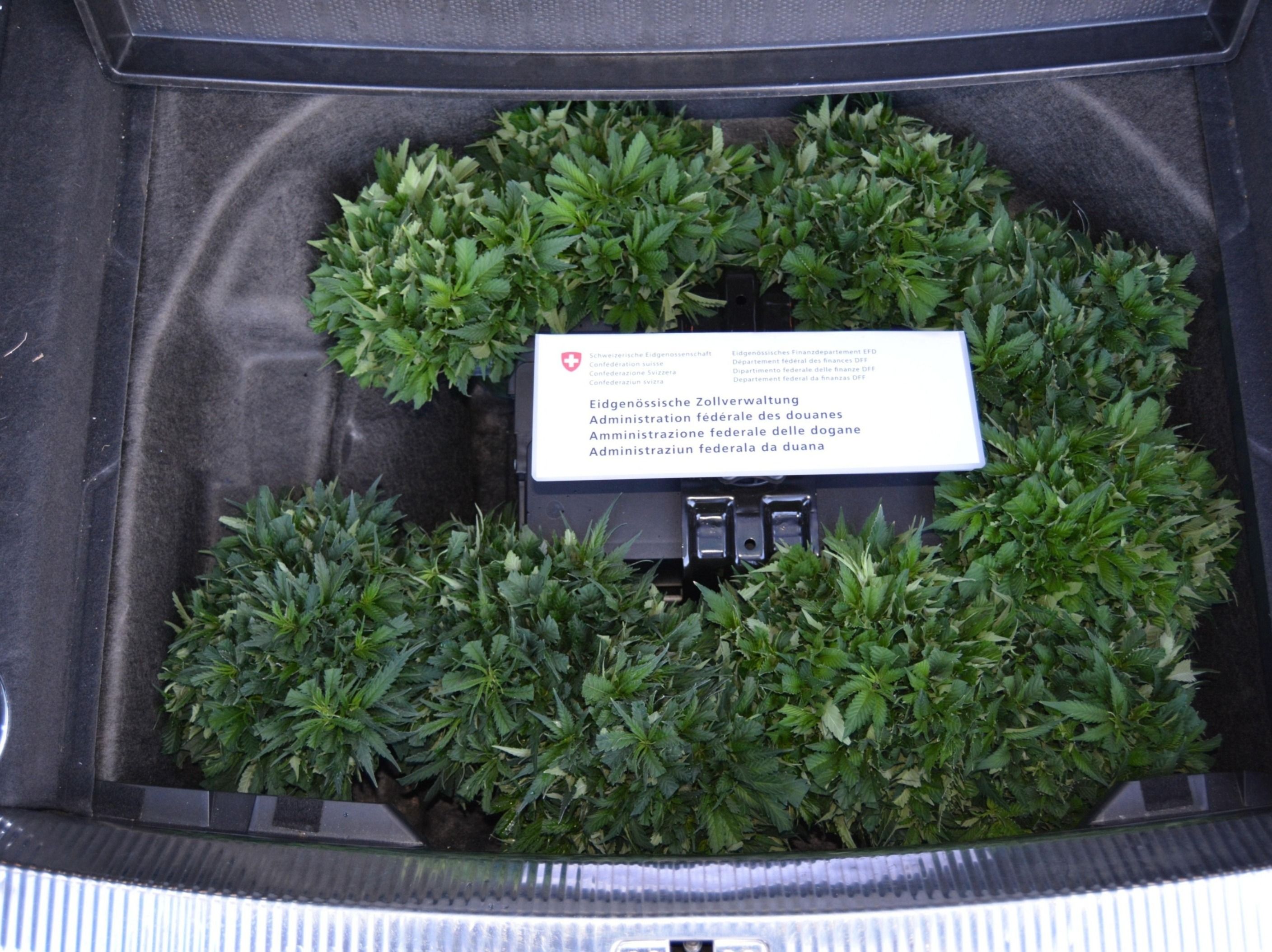 Kartonkiste im geöffneten Kofferraum eines Autos mit CH-Kennzeichen. — © BAZG