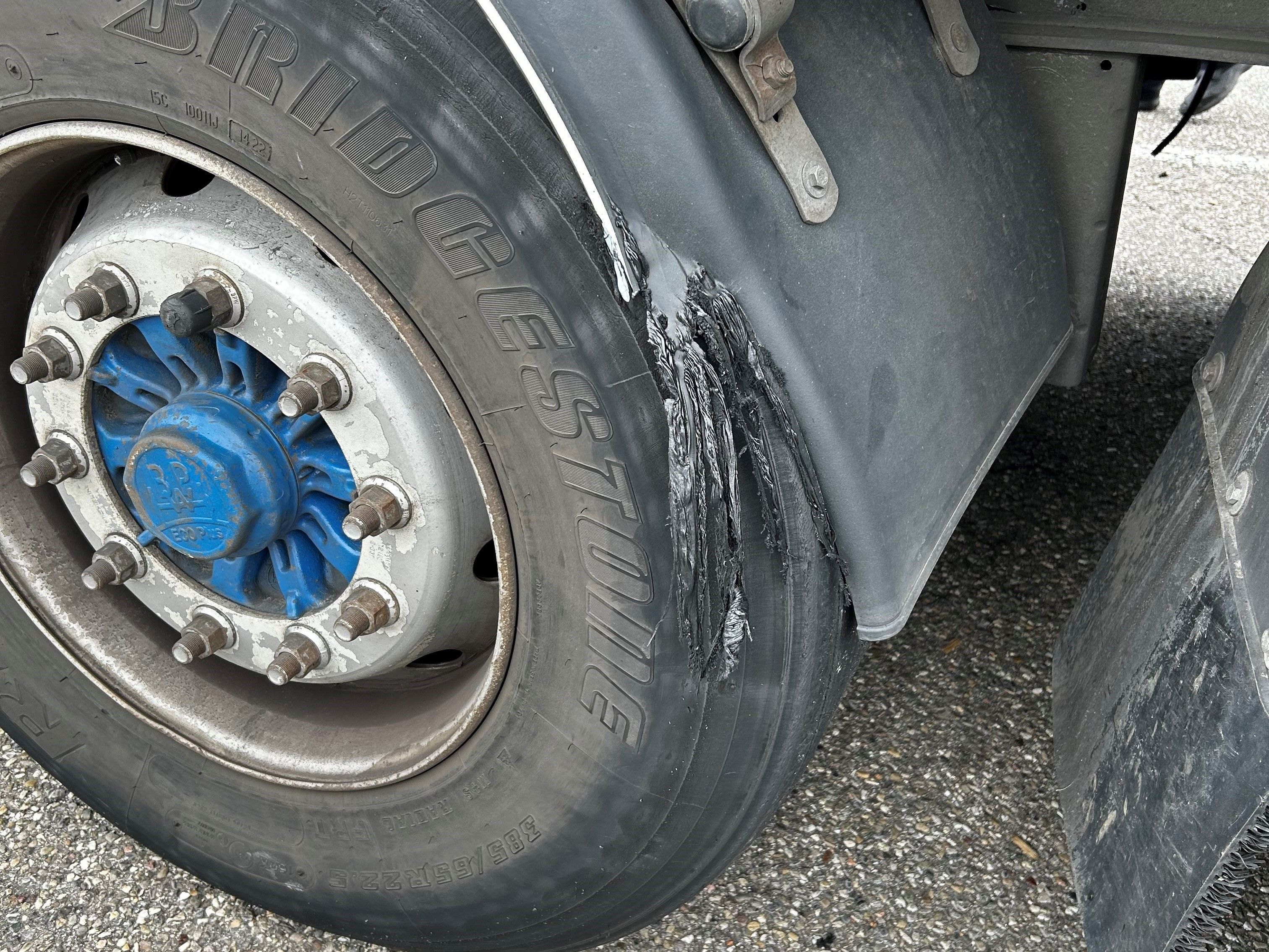 Ein beschädigter Kotflügel an einem LKW-Reifen, der deutliche Abnutzungsspuren aufweist. — © BAZG