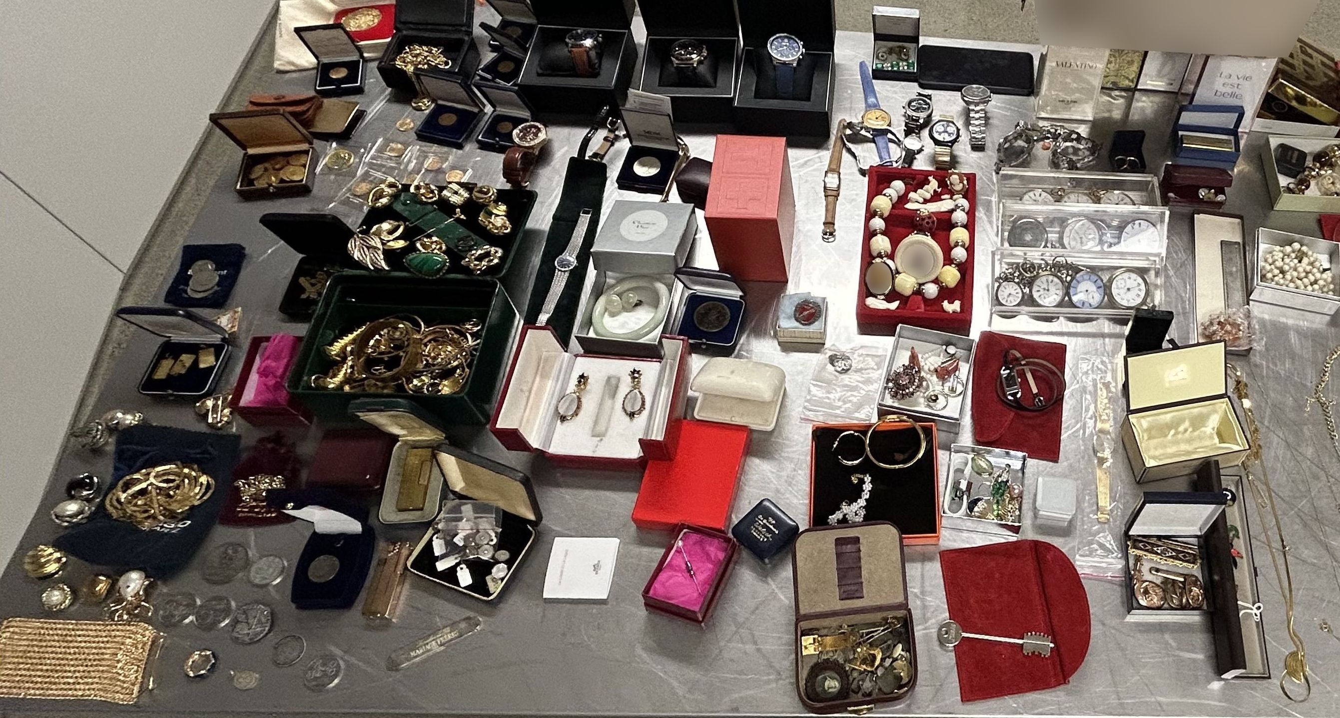 Sichergestellte Münzen, Uhren und Schmuckstücke auf einem Tisch ausgebreitet. — © BAZG Mitarbeitende des Bundesamts für Zoll und Grenzsicherheit (BAZG) stellten am Flughafen Zürich kürzlich rund fünf Kilogramm Kokain im Koffer eines Reisenden fest. Dieser war bereits am Vortag gelandet und holte seinen Koffer im Lost and Found ab.