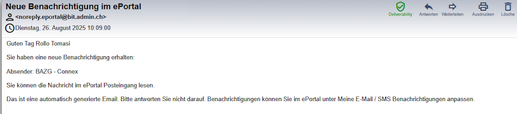 Wenn das BAZG Unterlagen von Ihnen braucht oder Ihnen Unterlagen zur Verfügung stellt, erhalten Sie die Informationen dazu im Posteingang des ePortals. Sie können in Ihrem Benutzerprofil einstellen, wie Sie weiter über solche Benachrichtigungen informiert werden wollen. Ihnen stehen die Möglichkeit via E-Mail oder SMS zur Verfügung. Sie erhalten vom ePortal ein Mail nach folgendem Muster.