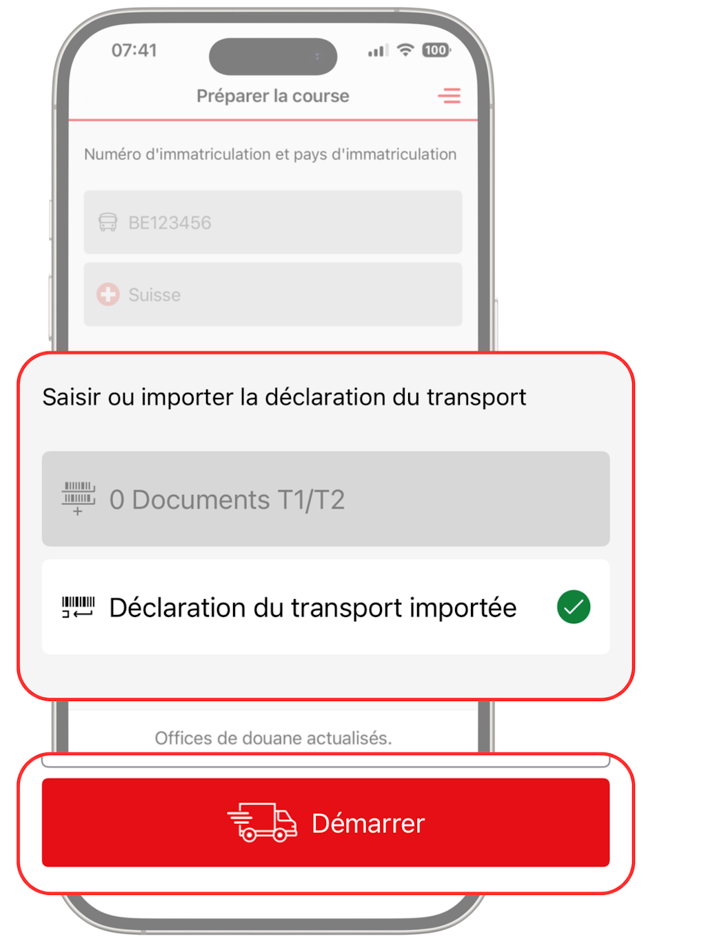 Si les données sont correctes, l’app affiche la mention « Déclaration du transport importée » avec une coche verte sur l’écran. Le chauffeur appuie sur « Démarrer » et peut commencer sa course.
