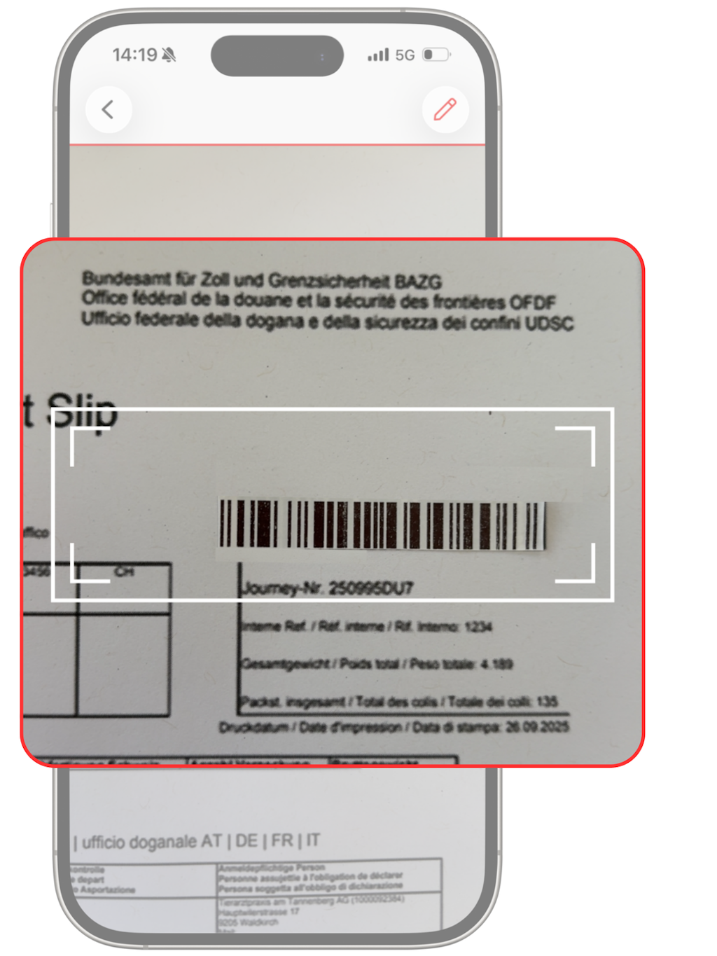 En cas de problème avec la caméra, il est également possible de saisir à la main le numéro de référence de la déclaration de transport (Journey Reference Number, JRN), situé sous le code-barres.