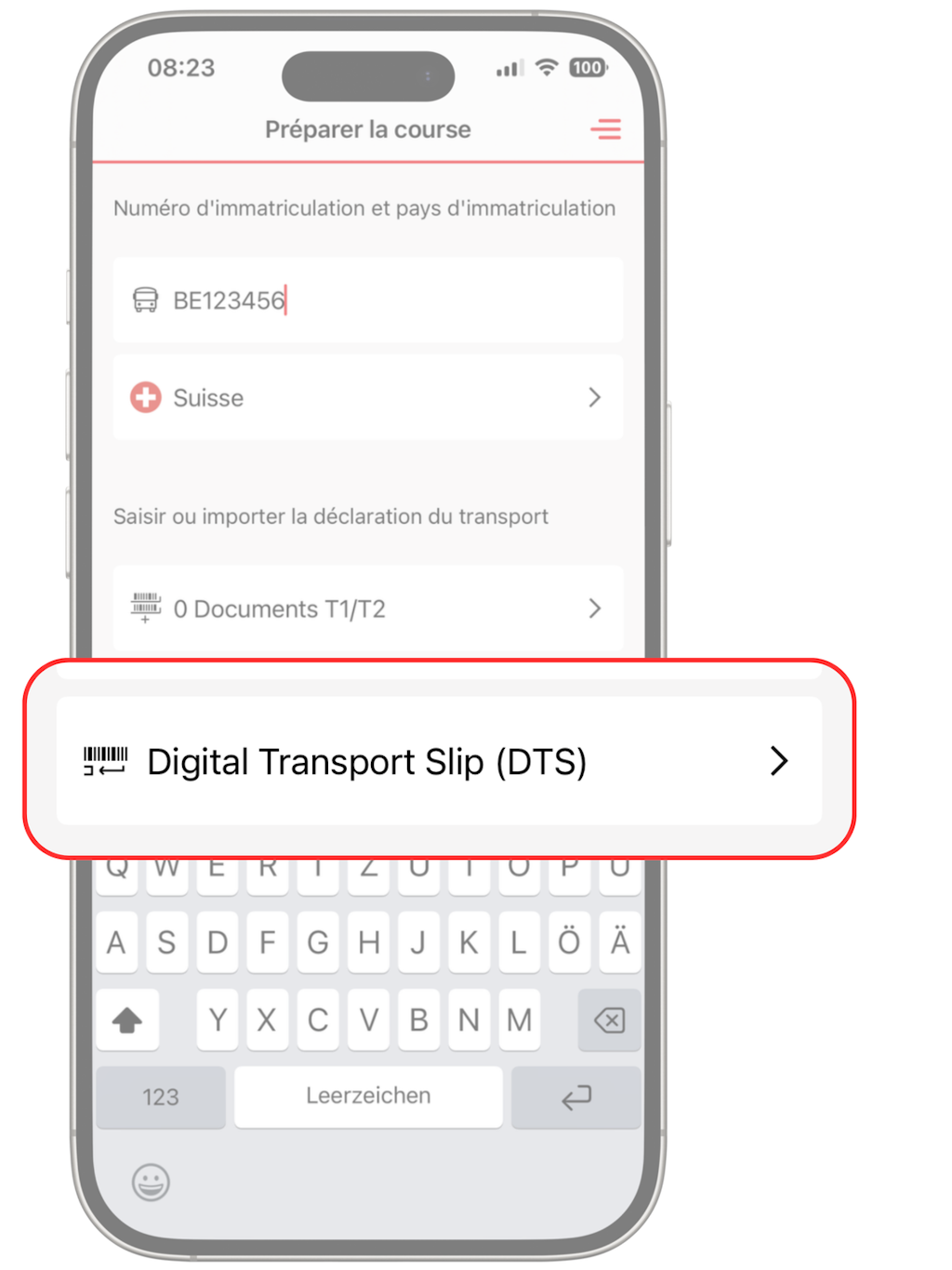 En appuyant sur le bouton « Digital Transport Slip (DTS) », il active la caméra du smartphone.