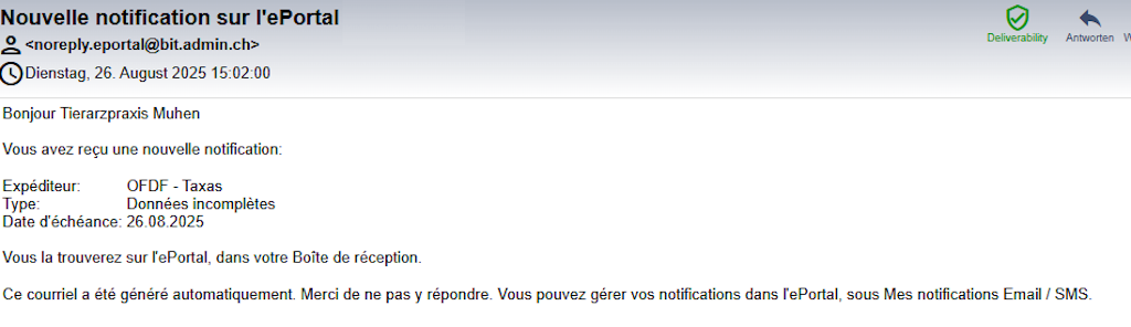 Lorsque l’OFDF a besoin de documents de votre part ou met des documents à votre disposition, vous recevez des informations à ce sujet dans la boîte de réception de l’ePortal. Vous pouvez définir dans votre profil d’utilisateur comment vous souhaitez être informé de telles notifications à l’avenir. Vous avez la possibilité de choisir entre l’envoi d’un courriel ou d’un SMS. Vous recevrez un courriel de l’ePortal correspondant au modèle suivant :