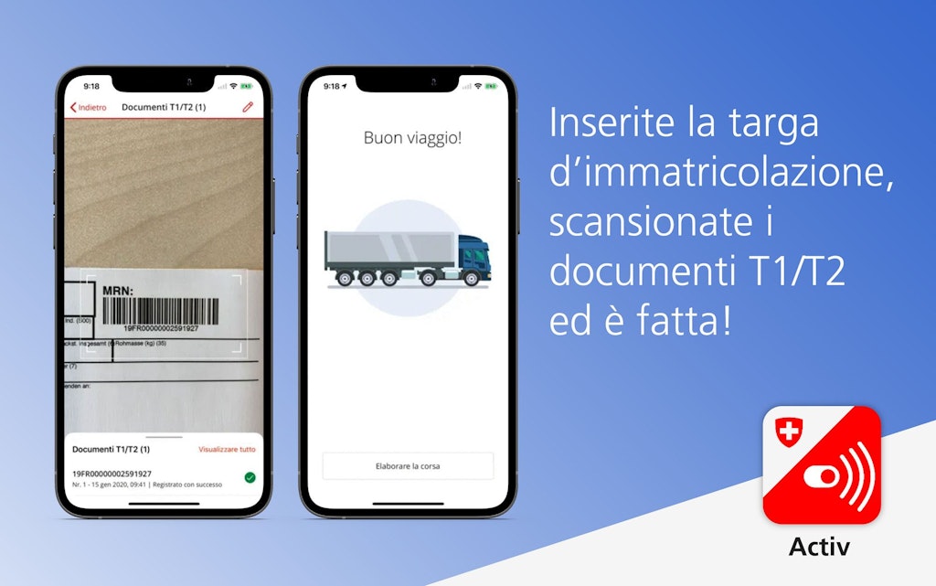 Utilizzate l'app gratuita Activ per gestire efficacemente i vostri documenti di transito e accelerare il passaggio doganale in Svizzera. L'app offre una semplice procedura in cinque passi per l'inserimento dei dati del veicolo e dei documenti.