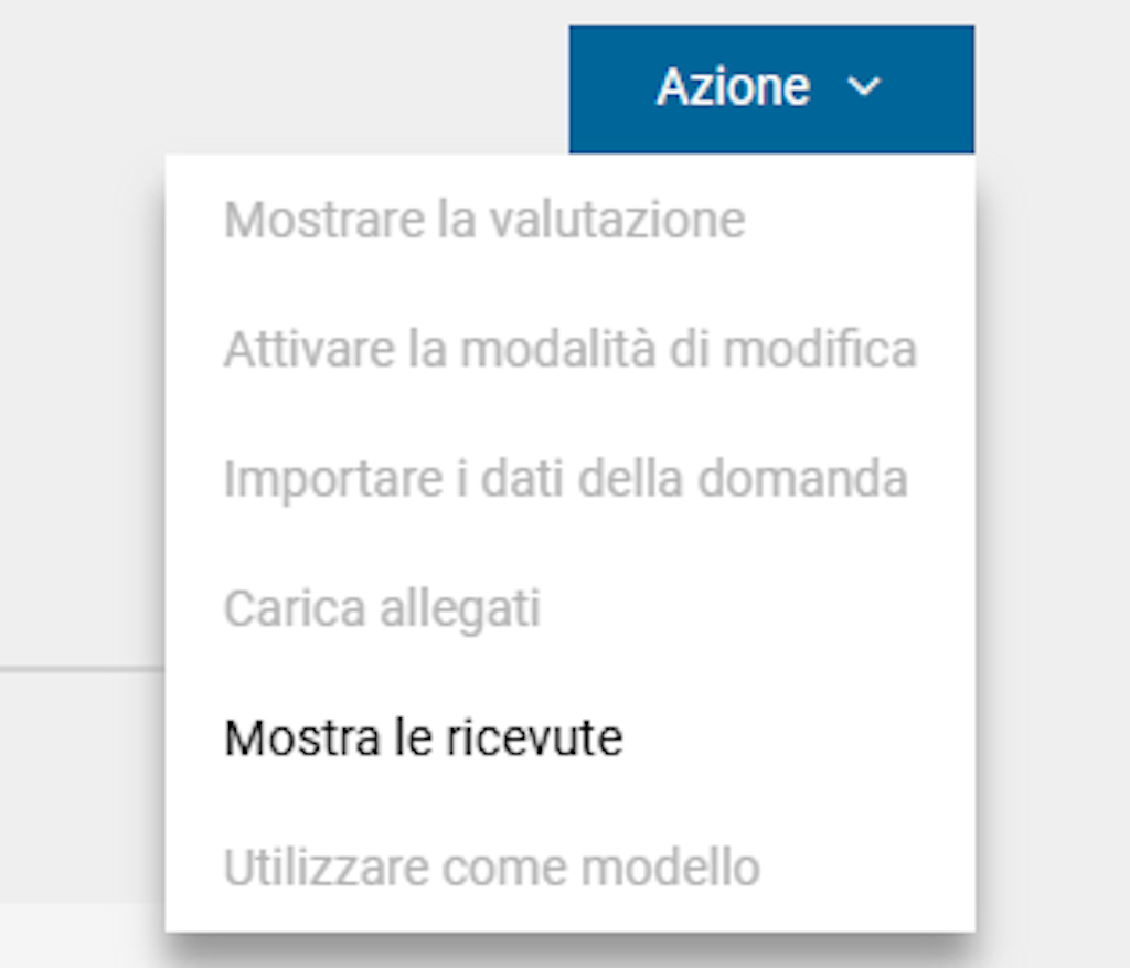 - Mostra le ricevute: questa voce rimanda direttamente a Chartera Output, dove è possibile consultare e scaricare tutti i documenti relativi alla domanda.